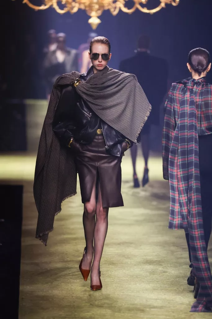 Η αλφαδιασμένη κομψότητα, αυτή που μοιάζει να μη λαθεύει σε τίποτα, αυτή είναι που συναντάς στη νέα συλλογή του Anthony Vaccarello για τον οίκο Sainto Laurent. Τα άψογα εκτελεσμένα tailored κοστούμια με φούστα (ταγέρ) τα οποία συνδυάζουν oversized σακάκια με έντονους, ενισχυμένους με βάτες, ώμους και pencil φούστες που σταματούν με ακρίβεια πάνω από το γόνατο (μ' ένα μικρό μπροστινό σκίσιμο), κατασκευασμένα από υφάσματα με "ανδρόγυνα" μοτίβα όπως το pinstripe, το glen check ή shepherd's check, είναι οι πρωταγωνιστές - και η ουσία - αυτής της συλλογής, ενώ ο Vaccarello φροντίζει να τα αναδείξει σε κάποια looks με την προσθήκη μιας τεράστιας εσάρπας την οποία συγκρατεί στον ώμο μία ογκώδης, χρυσή πόρπη.