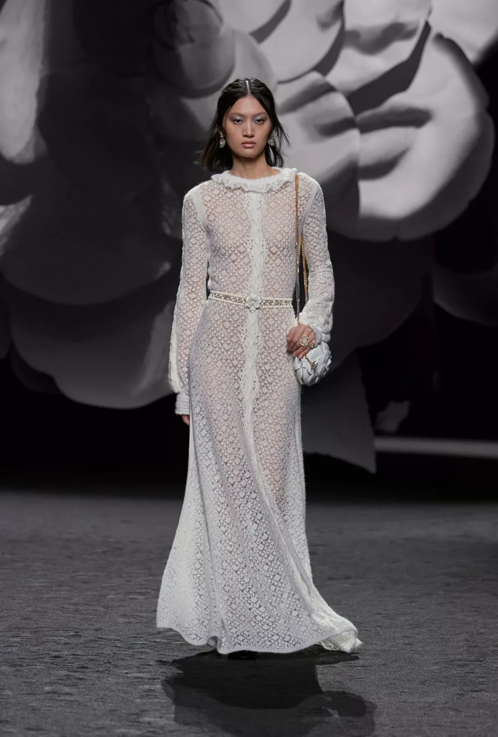 Πριν, όμως, περάσουμε στο τι είδαμε σ' αυτή τη νέα κολεξιόν της Chanel, που παρουσιάστηκε την τελευταία ημέρα της Εβδομάδα Μόδας του Παρισιού στο Grand Palais Éphémère, αξίζει να αναφερθούμε στους ιστορικούς δεσμούς ανάμεσα στην καμέλια και τον γαλλικό οίκου. Το μοτίβο της καμέλιας έκανε την πρώτη του εμφάνιση στις δημιουργίες της Chanel το 1913 και από τότε έχει αξιοποιηθεί σε ρούχα, τσάντες, παπούτσια, κοσμήματα, ακόμα και τις συσκευασίες του οίκου, ενώ οι νότες της έχουν αποτελέσει τη βάση για αρώματα και προϊόντα ομορφιάς.