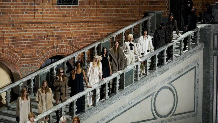 Λίγες ώρες μετά στο πιο εμβληματικό κτίριο της Στοκχόλμης, το Δημαρχείο, οι καλεσμένοι καθόμαστε περιμετρικά στην τεράστια κεντρική αίθουσα και παρακολουθούμε τις ηρωίδες της Max Mara Resort 2024 συλλογής να κατεβαίνουν από τη μεγαλοπρεπή σκάλα. Σύγχρονες folk νεράιδες φορούν χυτές τουνίκ, μακριές και κοντές, με μαύρες και ιβουάρ πλεξούδες, πομ πον, φούντες και καρφιά που θυμίζουν τα παραδοσιακά μοτίβα. Ένας καθηλωτικός μοντερνισμός επιτυγχάνεται με peasant μπλούζες από στητά μοντέρνα υφάσματα, απαλλαγμένες από κάθε διακόσμηση. Η πρακτική, ευθυτενής σιλουέτα της δεκαετίας του 1900 αποδίδεται με μοντέρνα μανίκια gigot, φούστες μέχρι τον αστράγαλο, κάπες μέχρι τον αγκώνα και μπλούζες που συνδυάζονται με παπιγιόν. Από τις αγαπημένες μου λεπτομέρειες τα φουσκωτά μανίκια στα κασμιρένια παλτό, οι oversized μανσέτες, τα μεταξωτά πουκάμισα με τα λυτά παπιγιόν.