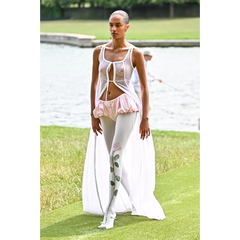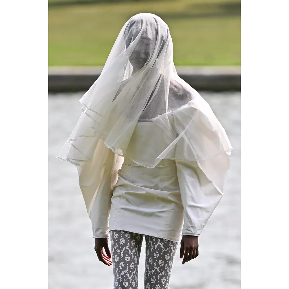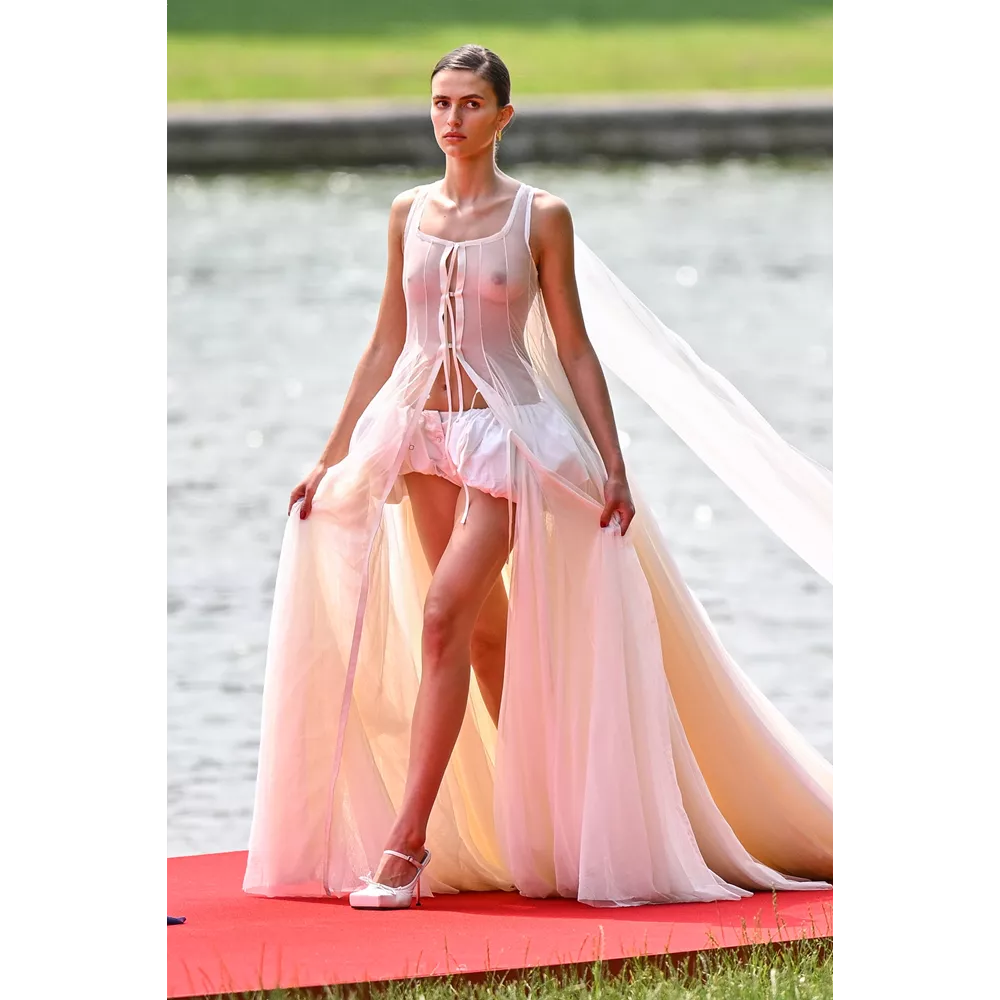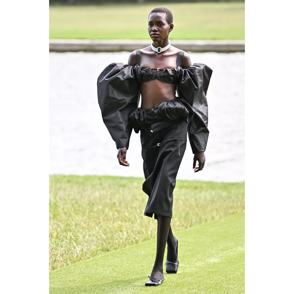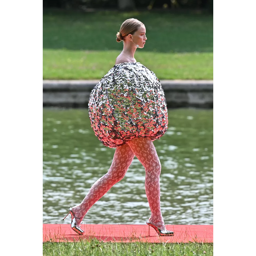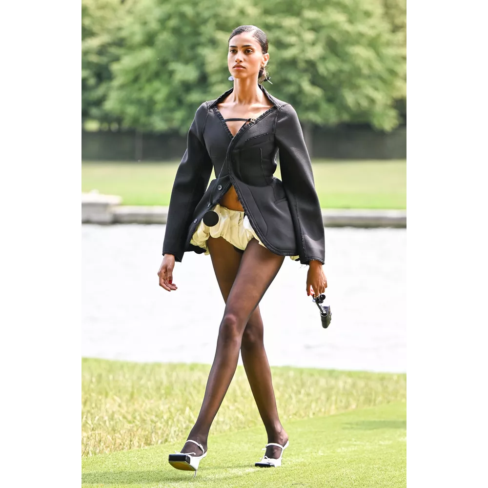 Ο Jacquemus έδωσε στη συλλογή του τον τίτλο "Le ChouChou", όπως αποκαλεί τη σειρά του με scrunchies (λαστιχάκια για τα μαλλιά). Όχι τυχαία, βεβαίως, αφού κάποιες από τις σιλουέτες στα looks της collections θυμίζουν σε όγκο και την "αφρατάδα"...γιγαντιαία scrunchies! Αυτό, ωστόσο, που είναι κυρίαρχο στη συλλογή είναι η έμπνευση που αντλεί από τις Βερσαλλίες, αφού τα περισσότερα looks αποτελούν μία σύγχρονη μεταφορά της αμφίεσης στην αυλή τους: κρινολίνα, φουφούλες, δαντέλες, τουτού, φουσκωτά μανίκια, negligé φορέματα και πέπλα στις αποχρώσεις του λευκού, κατά κύριο λόγο, δίνουν τον τόνο για τη νέα εκδοχή του ανάλαφρου, αβίαστου σέξι που προτείνει ο Jacquemus σε κάθε του σχεδόν συλλογή. Το καινούργιο αξεσουάρ που παρουσίασε είναι το clutch La Pochette rond carré, αλλά και μία ακόμα τσάντα με στρογγυλό χερούλι, σαν μία εξέλιξη της Le sac Rod, ενώ μεγάλη επιτυχία αναμένεται να κάνουν και οι ψηλοτάκουνες και φλατ μπαλαρίνες - mules με την τετράγωνη μύτη που ολοκλήρωσαν τα περισσότερα looks της συλλογής.