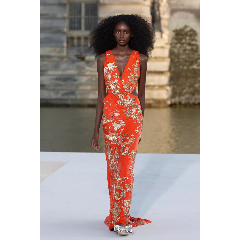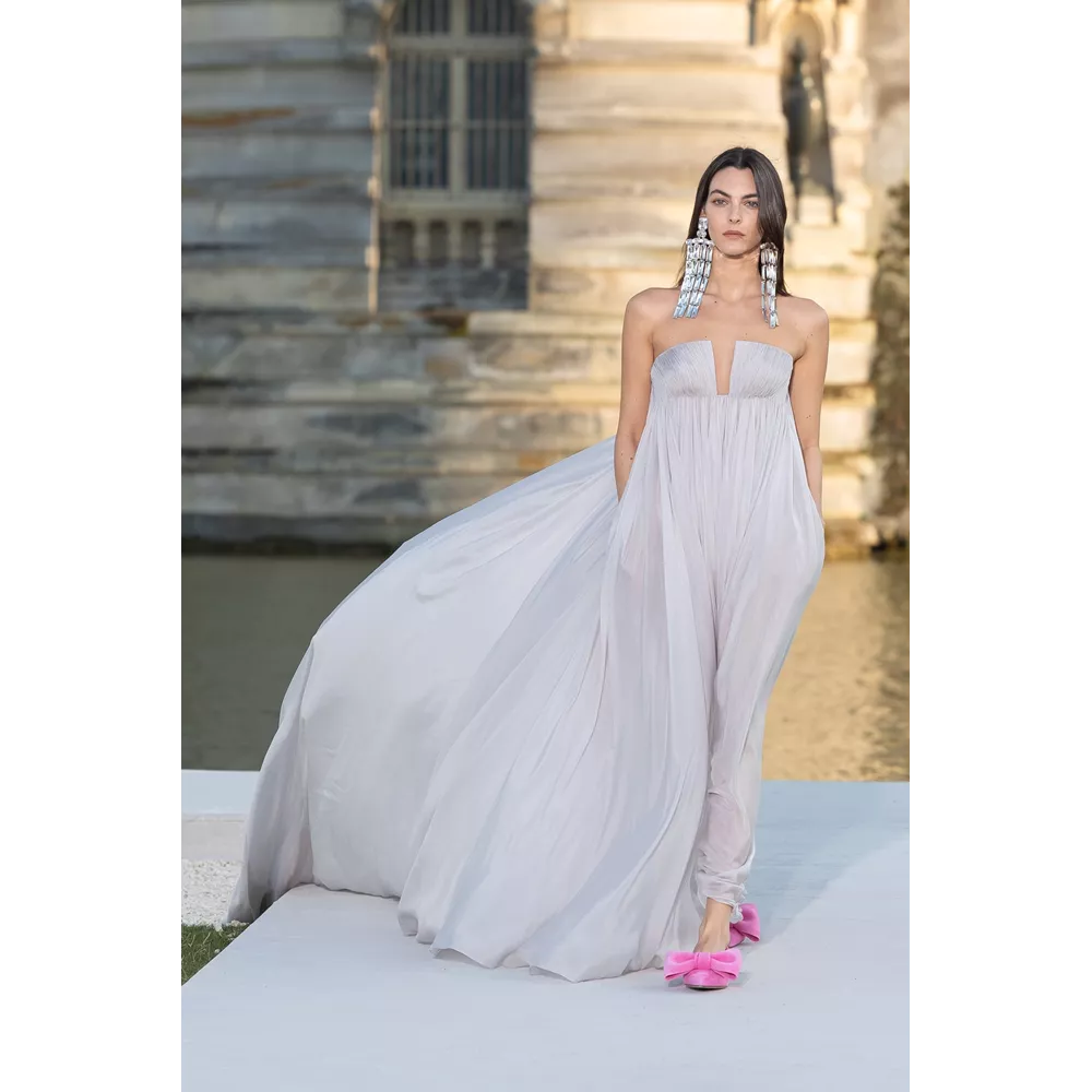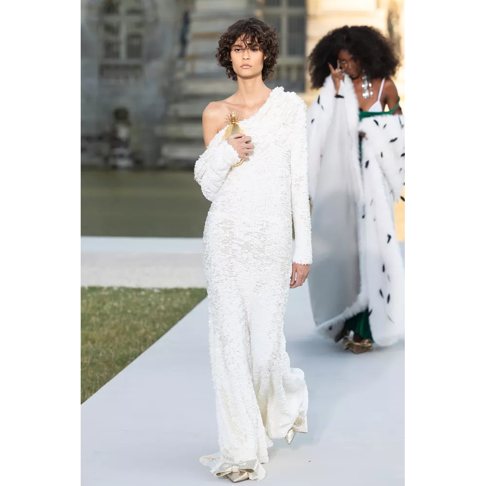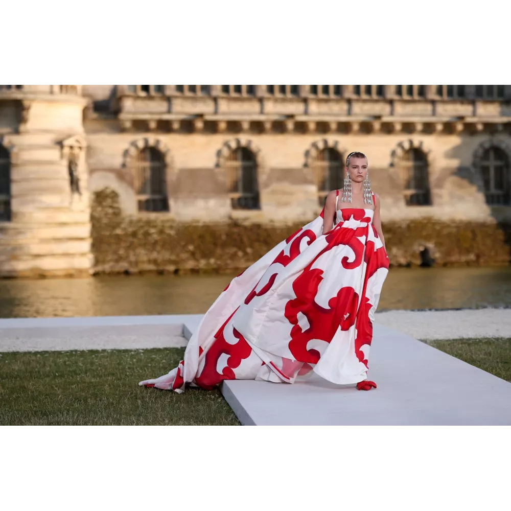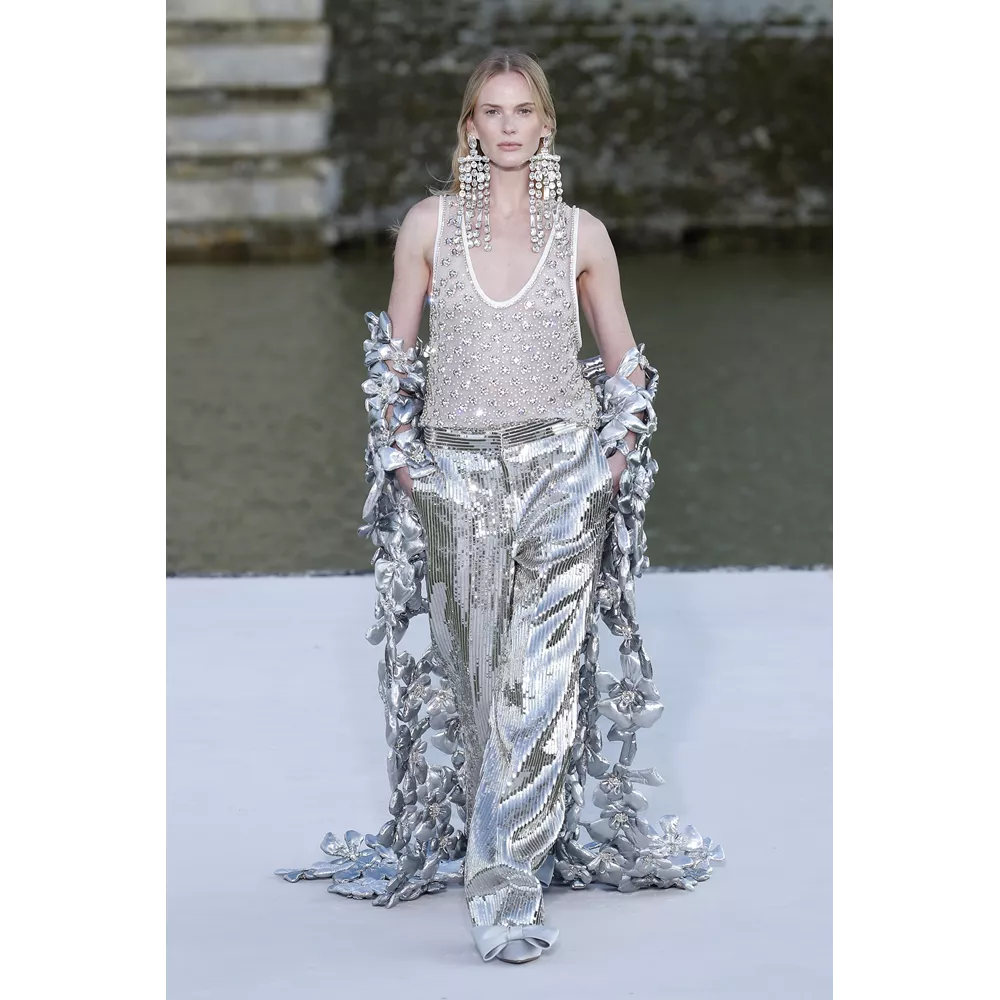 Το ροκοκό στιλ (που χαρακτηρίζεται από εξτραβαγκάντζα) στη διακόσμηση των δωματίων του Château de Chantilly φαίνεται ότι έχει εμπνεύσει σειρά από μοτίβα και "κοψίματα" σε κάποια από τα looks της συλλογής, τα οποία δείχνουν τόσο σύγχρονα και ανάλαφρα, έχοντας ωστόσο δανειστεί κάτι από ένα πολύ μακρύ παρελθόν. Προσθέστε σ' αυτή τη διαπίστωση και τα XXL chandelier σκουλαρίκια που συμπληρώνουν τα περισσότερα σύνολα - ακόμα και αυτά με τα jeans- και το ταξίδι στην εποχή της γαλλικής αναγέννησης μοιάζει πραγματικά να φλιτάρεται μέσα από την έννοια που έχει αποκτήσει σήμερα η χλιδή: αυτή της υποσημείωσης και όχι του κυρίως κειμένου.