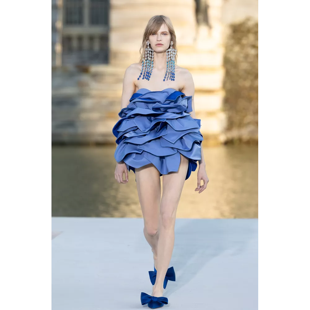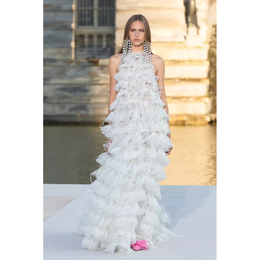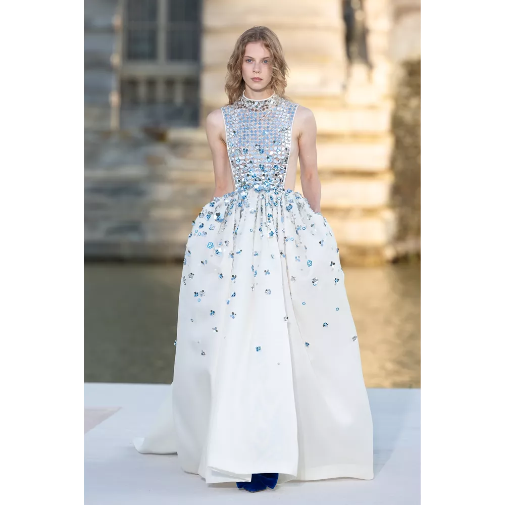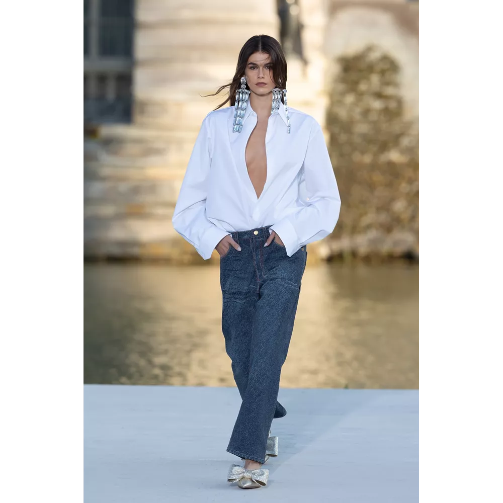 "Η απλότητα είναι η λύση της πολυπλοκότητας". Ο Pierpaolo Piccioli δανείστηκε τα λόγια του γλύπτη και ζωγράφου Constantin Brancusi για να εξηγήσει στους δημοσιογράφους που βρέθηκαν στα παρασκήνια του show την ιδέα στην οποία εστιάζει η νέα haute couture συλλογή Valentino: την απλότητα που όμως κρύβει δεξιοτεχνία. Το πρώτο look της συλλογής, με το οποίο άνοιξε το show η Kaia Gerber, δεν θα μπορούσε να είναι πιο ενδεικτικό: λευκό oversized πουκάμισο, τζιν παντελόνι και statement αξεσουάρ. Το τζιν, βεβαίως, που φοράει η Gerber δεν είναι ένα απλό τζιν, κρύβει τεράστια τεχνική από πίσω του αφού αποτελεί αναδημιουργία με μεταξωτό ύφασμα ενός κλασικού Levi’s και είναι κεντημένο με μικροσκοπικές μαργαριταρένιες χάντρες οι οποίες βάφτηκαν σε 80 διαφορετικές αποχρώσεις του indigo για να αναπαραστήσουν την όψη του ντένιμ.