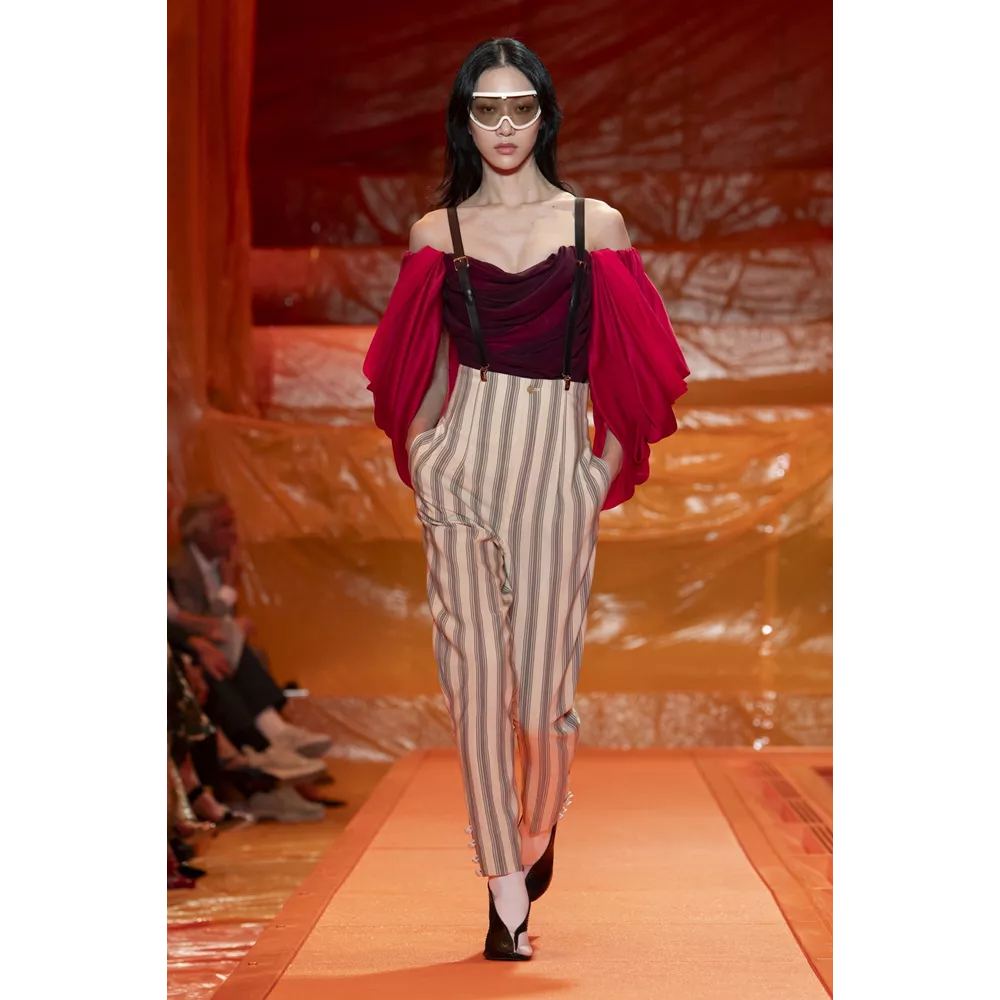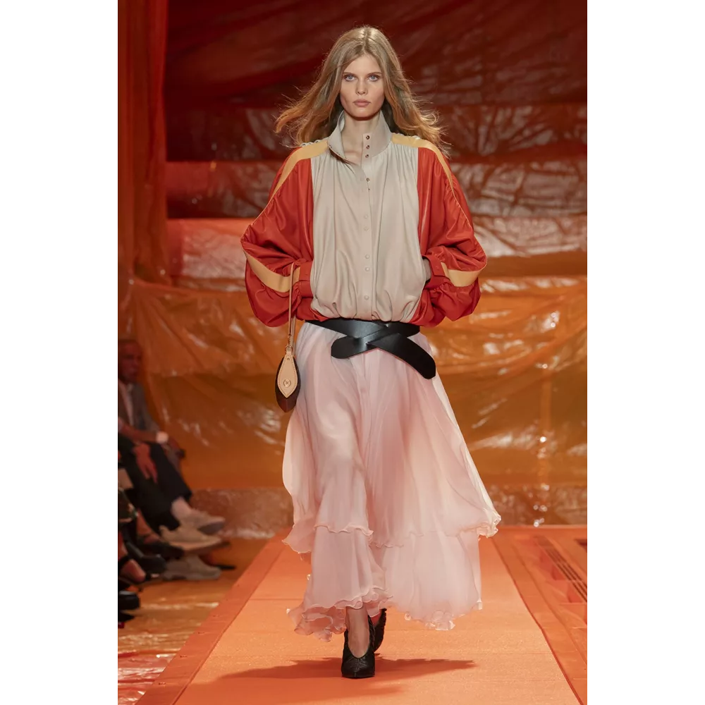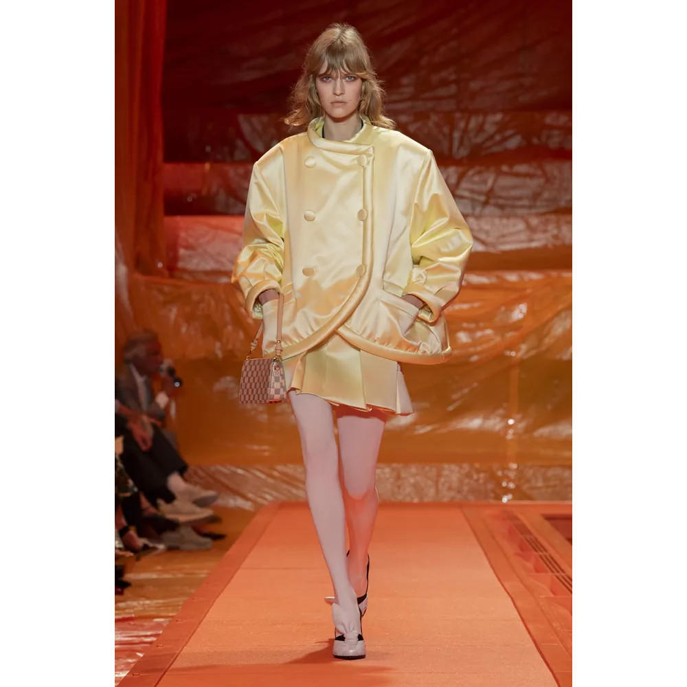 To show του οίκου Louis Vuitton πραγματοποιήθηκε στο Παρίσι, στον αριθμό 103 της λεωφόρου Champs-Élysées σ' ένα χώρο που ο σχεδιαστής παραγωγής James Chinlund μεταμόρφωσε σε κάτι που θύμιζε ...αερόστατο, για την ακρίβεια το εσωτερικό του, και που το φωτεινό πορτοκαλί χρώμα των πλαστικών με το οποίο είχε καλύψει τα πάντα, από τους τοίχους μέχρι τα καθίσματα, αντανακλούσε τις θερμές καλοκαιρινές μέρες στις οποίες απευθύνεται αυτή η συλλογή - όπως ασφαλώς αποτυπώνει και το ταξιδιάρικο πνεύμα Louis Vuitton. Από το front row δεν απουσίαζαν, βεβαίως, οι μούσες του οίκου όπως η Zendaya, η Ana de Armas, η Alicia Vikander, η Saoirse Ronan, η Jennifer Connelly κ.ά, φίλες του οίκου όπως η Cate Blanchett και η Cynthia Erivo, αλλά και ο καλλιτεχνικός διευθυντής των ανδρικών συλλογών της Louis Vuitton, Pharrell Williams.