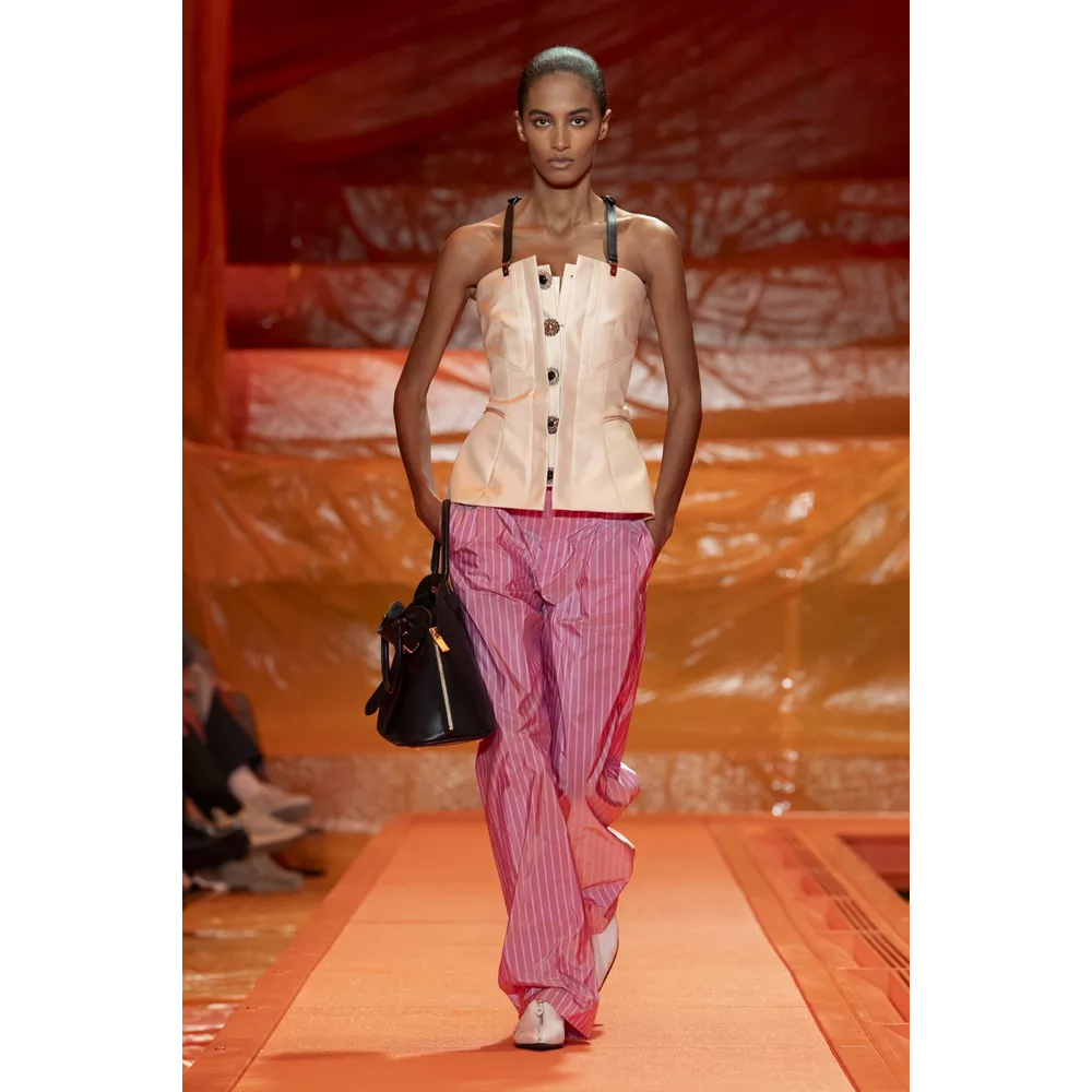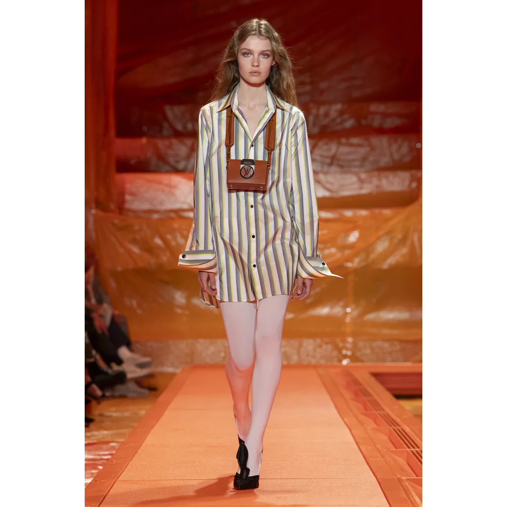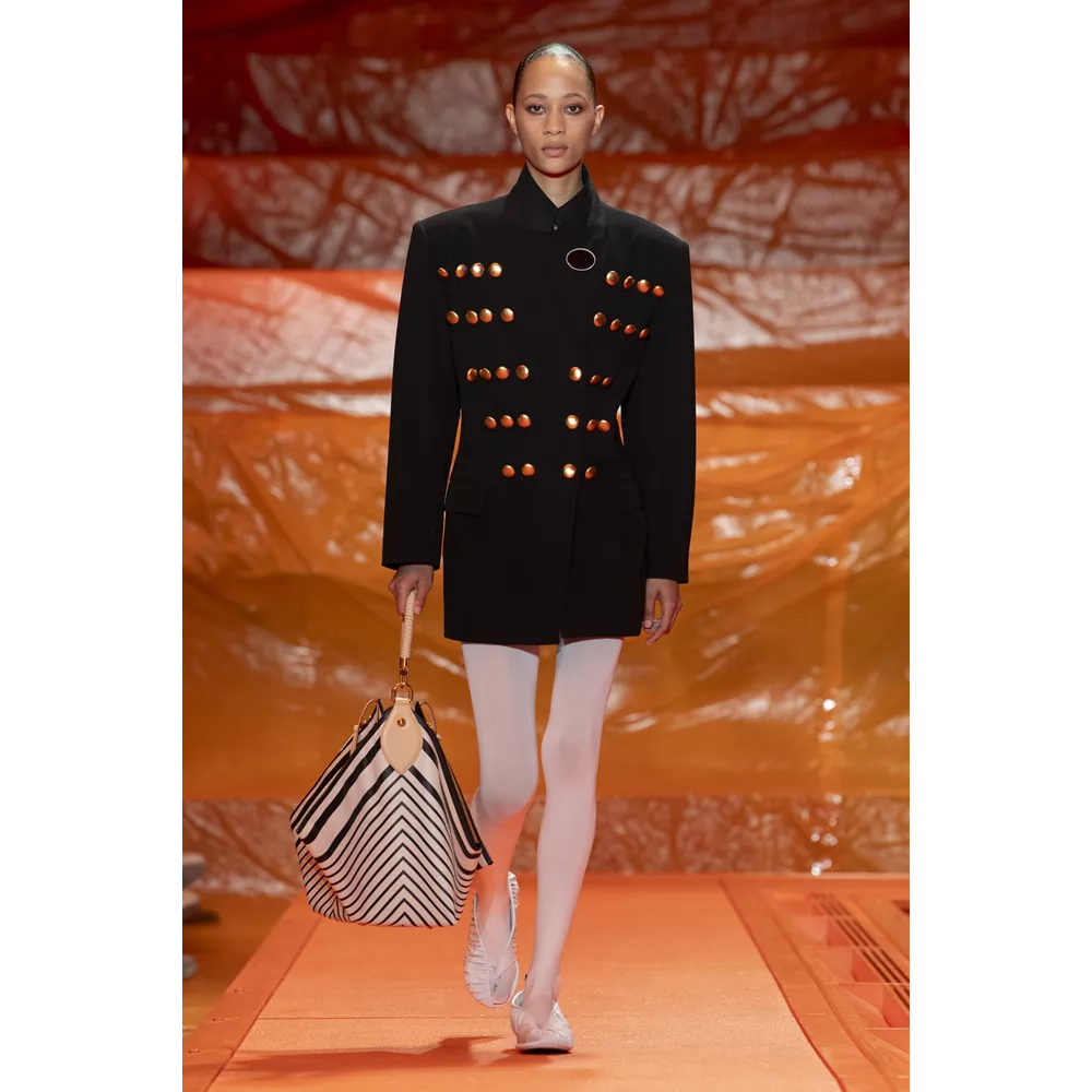 To show του οίκου Louis Vuitton πραγματοποιήθηκε στο Παρίσι, στον αριθμό 103 της λεωφόρου Champs-Élysées σ' ένα χώρο που ο σχεδιαστής παραγωγής James Chinlund μεταμόρφωσε σε κάτι που θύμιζε ...αερόστατο, για την ακρίβεια το εσωτερικό του, και που το φωτεινό πορτοκαλί χρώμα των πλαστικών με το οποίο είχε καλύψει τα πάντα, από τους τοίχους μέχρι τα καθίσματα, αντανακλούσε τις θερμές καλοκαιρινές μέρες στις οποίες απευθύνεται αυτή η συλλογή - όπως ασφαλώς αποτυπώνει και το ταξιδιάρικο πνεύμα Louis Vuitton. Από το front row δεν απουσίαζαν, βεβαίως, οι μούσες του οίκου όπως η Zendaya, η Ana de Armas, η Alicia Vikander, η Saoirse Ronan, η Jennifer Connelly κ.ά, φίλες του οίκου όπως η Cate Blanchett και η Cynthia Erivo, αλλά και ο καλλιτεχνικός διευθυντής των ανδρικών συλλογών της Louis Vuitton, Pharrell Williams.