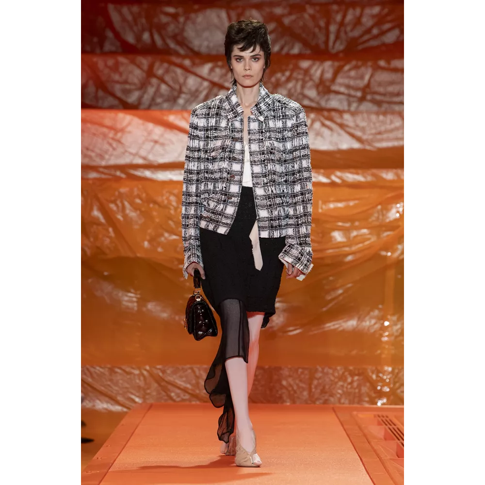 Αυτό το "παιχνίδι" με τα διαφορετικά μοτίβα και χρώματα σταματά, όμως, εδώ και τη θέση του θα πάρουν: ριγέ πουκάμισα φορεμένα χωρίς bottom, μόνο με λευκό καλσόν, αποντούν στο σοφιστικέ σέξι, ανάγλυφα κορσέ τοπ και αμάνικα puffer τοπ σε καρό που συνδυάζονται στην πρώτη περίπτωση με γυαλιστερά ριγέ και στη δεύτερη με denim και leather παντελόνια προσφέρουν μία νέα πρόταση casual style, σατινένια ταγέρ με oversized σταυροκούμπωτα σακάκια και πλισέ μίνι φούστες απηχούν ένα σύγχρονο girly, sequin πουκάμισα φορεμένα με γυαλιστερές δερμάτινες μίνι φούστες σε σχήμα καμπάνας γίνονται η εναλλακτική των party looks του τώρα, pinstripe φούστες συνδυασμένες με τζάκετ από λουστρίνι και ριγέ πουκάμισα με τονισμένους, μυτερούς ώμους φορεμένα με pencil skirt έρχονται να πάρουν τη θέση τους ως ένα εναλλακτικό workwear, ασύμμετρες tweed φούστες και καρό tweed σακάκια κεντημένα με πούλιες βάλουν τη απαραίτητη french πινελιά στα looks, μίνι φορέματα με επιτηδευμένα πλισέ και βολάν έρχονται ως κάτι διαφορετικό, και λίγο θεατρικό), όπως εξάλλου και τα ψηλόμεσα ριγέ παντελόνια που κρατούν τιράντες πάνω από off-shoulder υπερ-ντραπέ μπλούζες. Τέλος, σακάκια και φορέματα διακοσμούνται με κουμπιά που μοιάζουν με faux κοσμήματα, άλλα (σακάκια) προτείνονται με παραμορφωμένο το (πολύ γαλλικό) πιε - ντε - πουλ μοτίβο, ενώ slip φορέματα αξιοποιούν το πολύ casual μοτίβο τις ρίγας σε looks που προορίζονται για βράδυ.