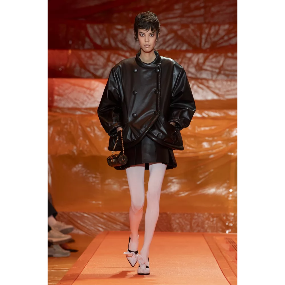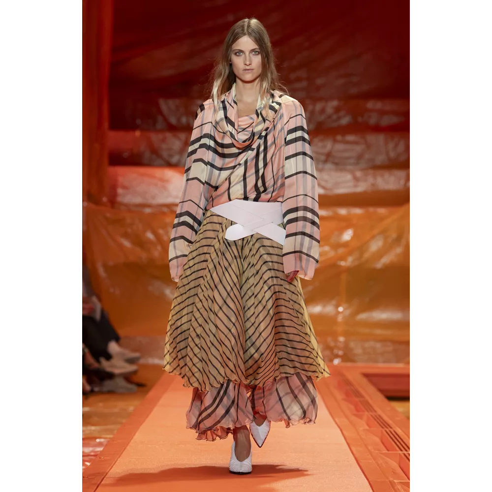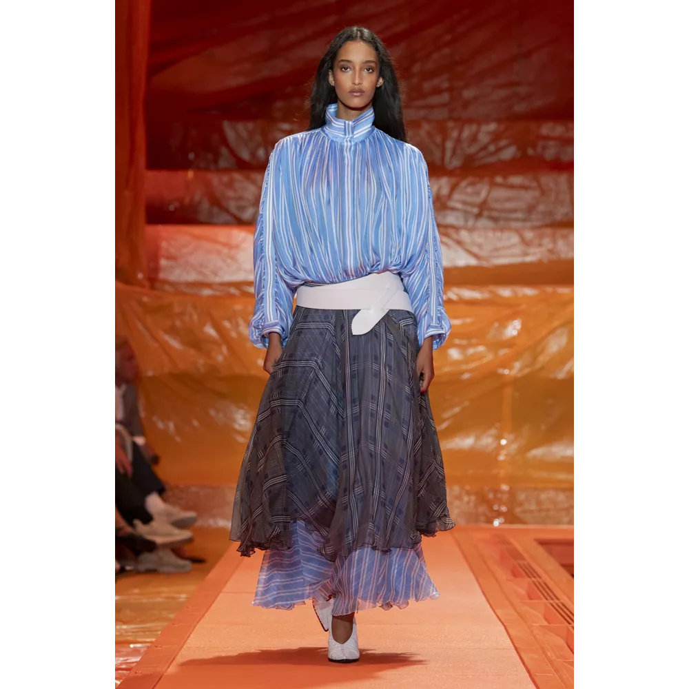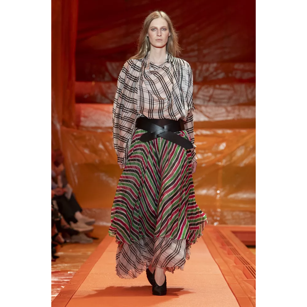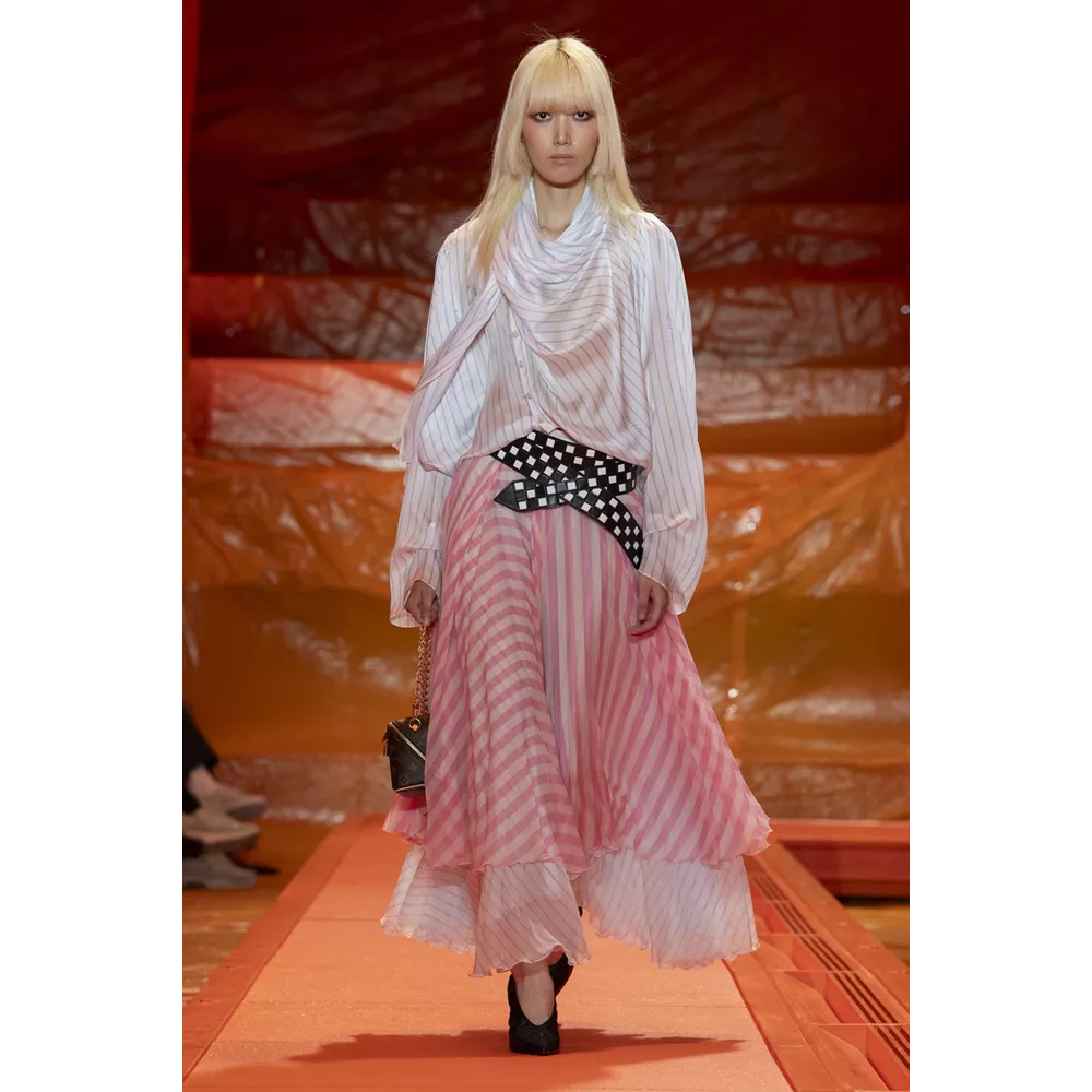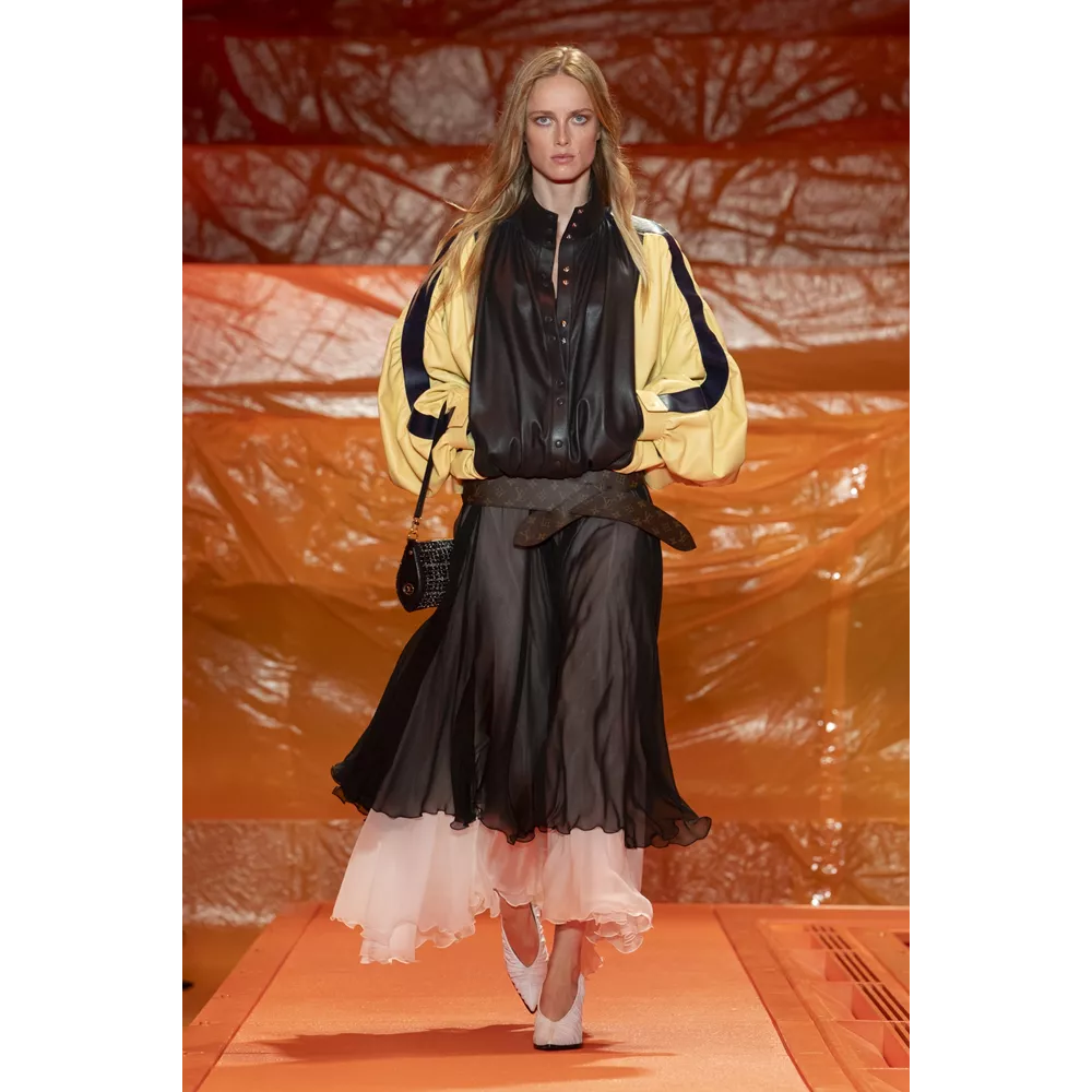 Στις πιο δυνατές στιγμές της Louis Vuitton SS'24 ανήκουν το ευρηματικό layering με διαφορετικά μοτίβα. Το show ξεκίνησε με looks όπου τα bomber jackets με πλισέ λεπτομέρειες στα μανίκια που τα κάνουν πιο θηλυκά συνδυάζονται με σιφόν φούστες με βολάν και φαρδιές ζώνες. Τα bombers διαδέχονται μια σειρά από βολάν φορέματα με ριγέ και καρό μοτίβα που συνδυάζονται σε layering με φούστες διαφορετικού μοτίβου από την ίδια γκάμα και φαρδιά ζώνη φορεμένη χαμηλά, όπως στα early ’00s. Νοσταλγία και ματιά στο μέλλον του στιλ "μπλέκουν" μοναδικά στα συγκεκριμένα στιλ.