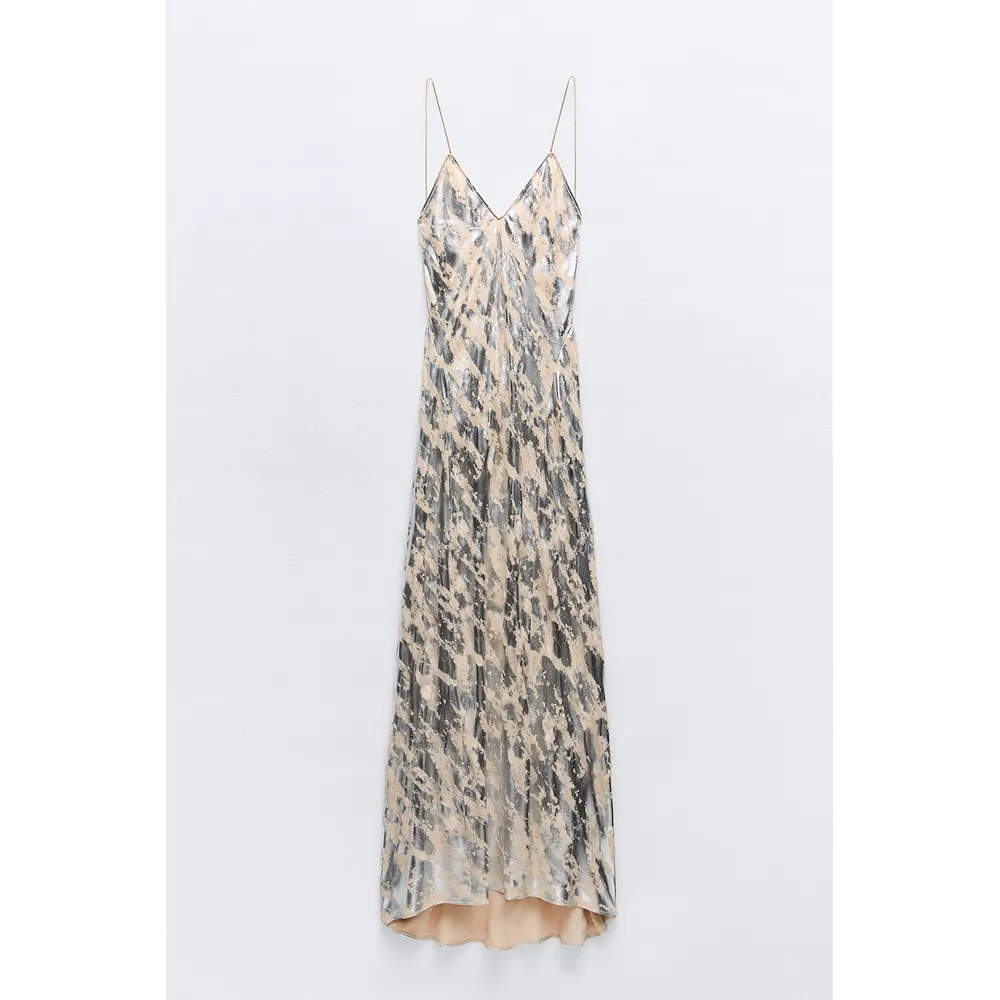 Εμπριμέ φόρεμα σε στιλ lingerie με τύπωμα foil, Zara.