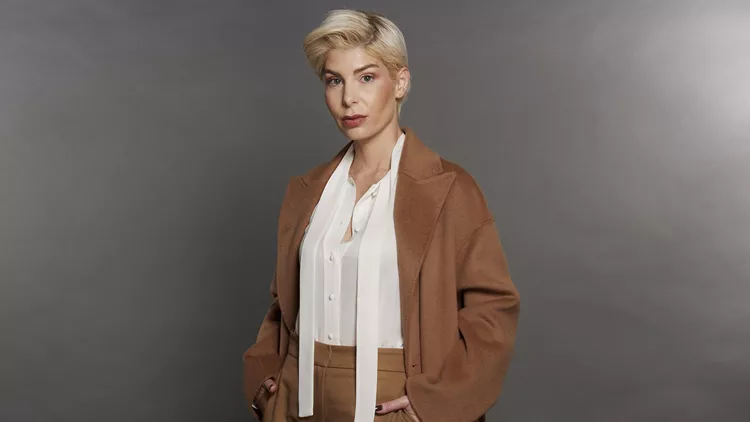 Καμηλό παλτό σταυρωτό με μαλλί και κασμίρι, λευκό πουκάμισο με γραβάτα σε ολομέταξη ζορζέτα και wide leg παντελόνι σε γκαμπαρντίνα, LOLA.