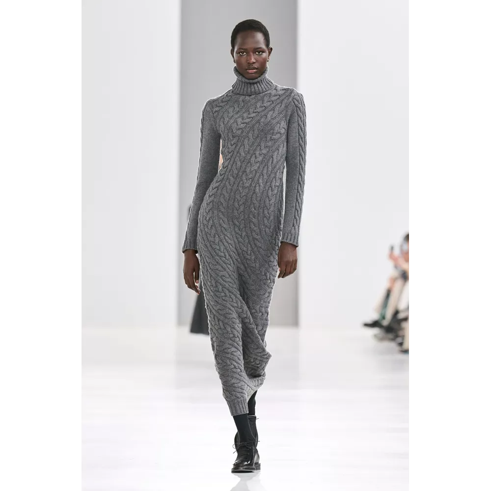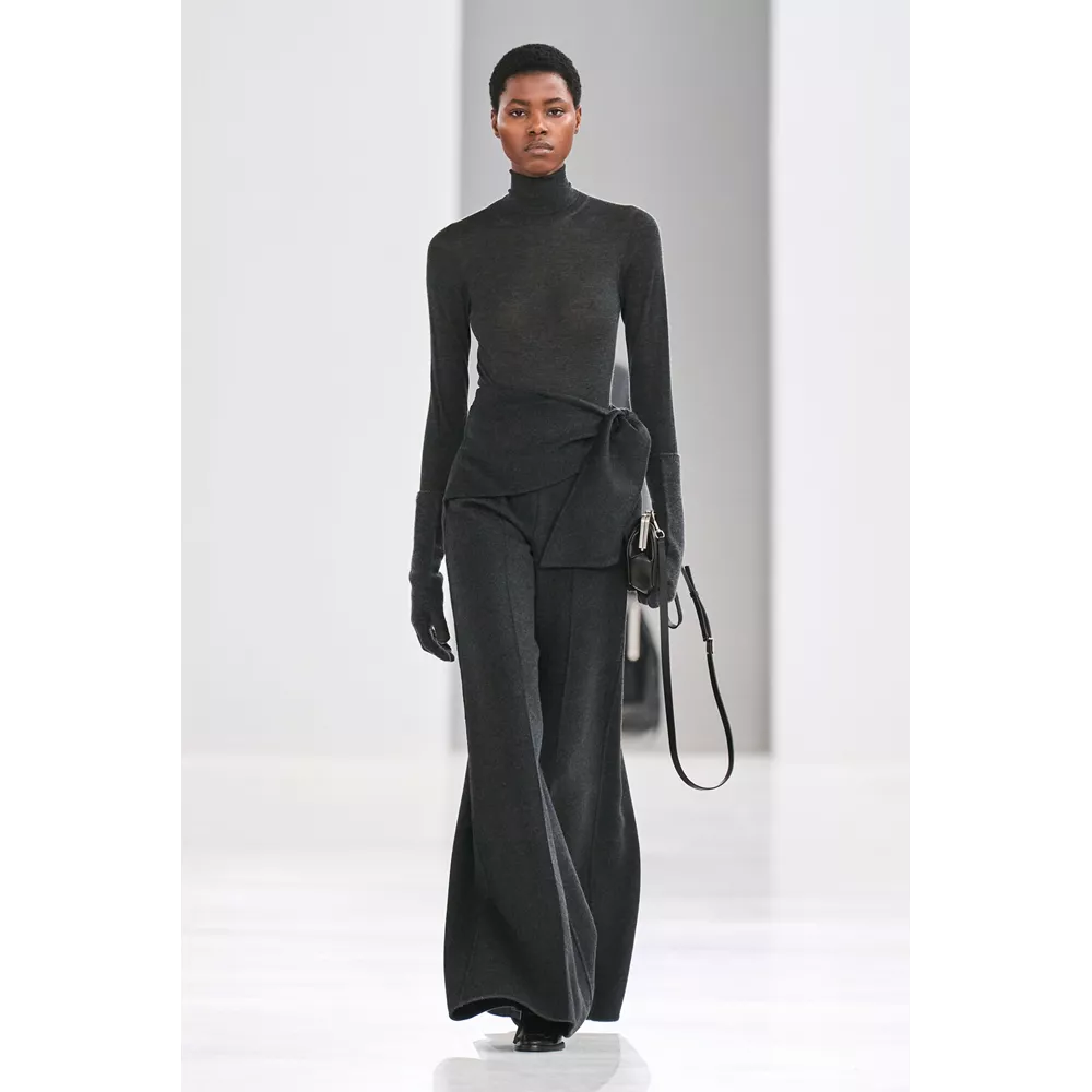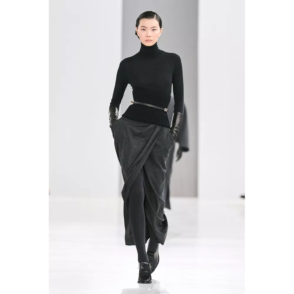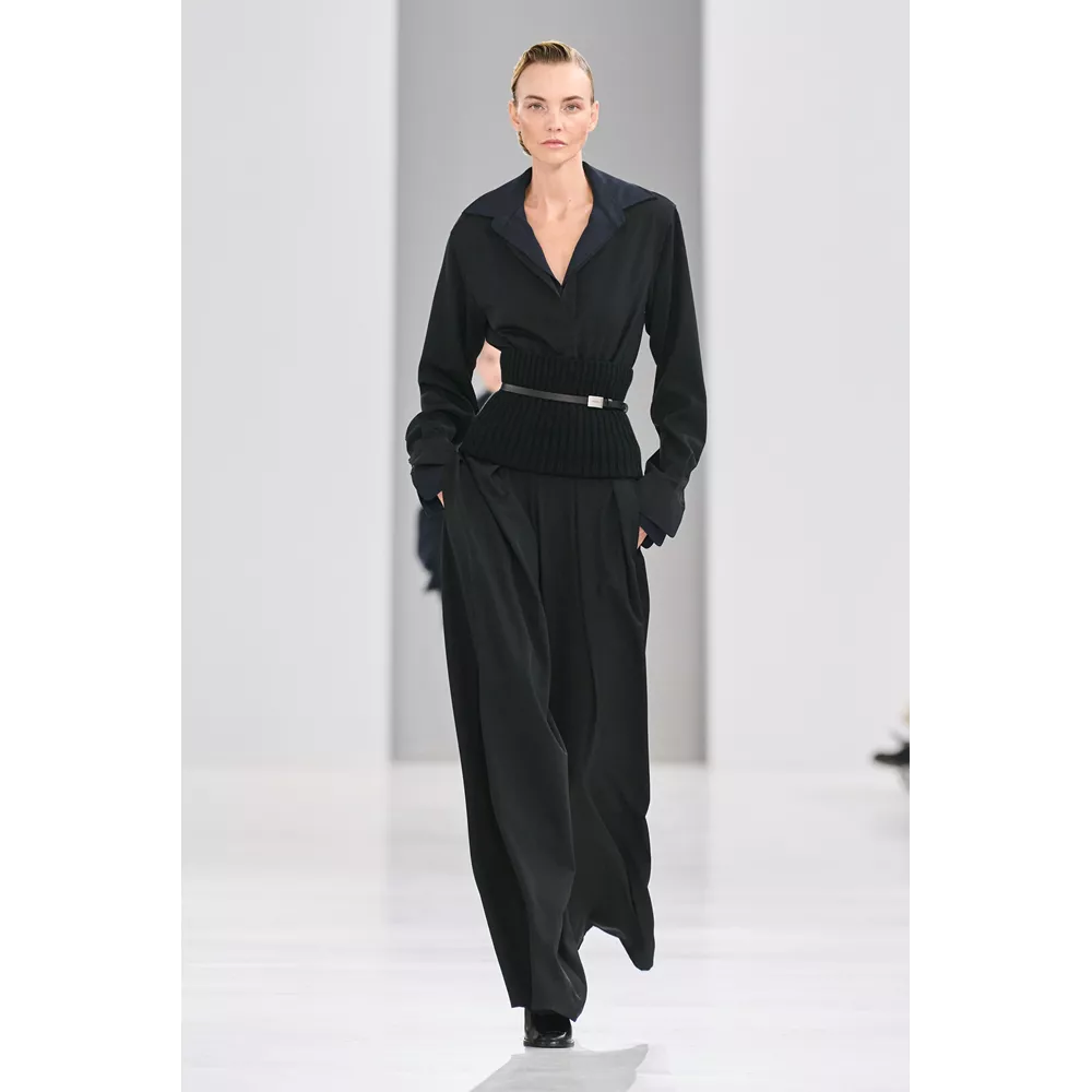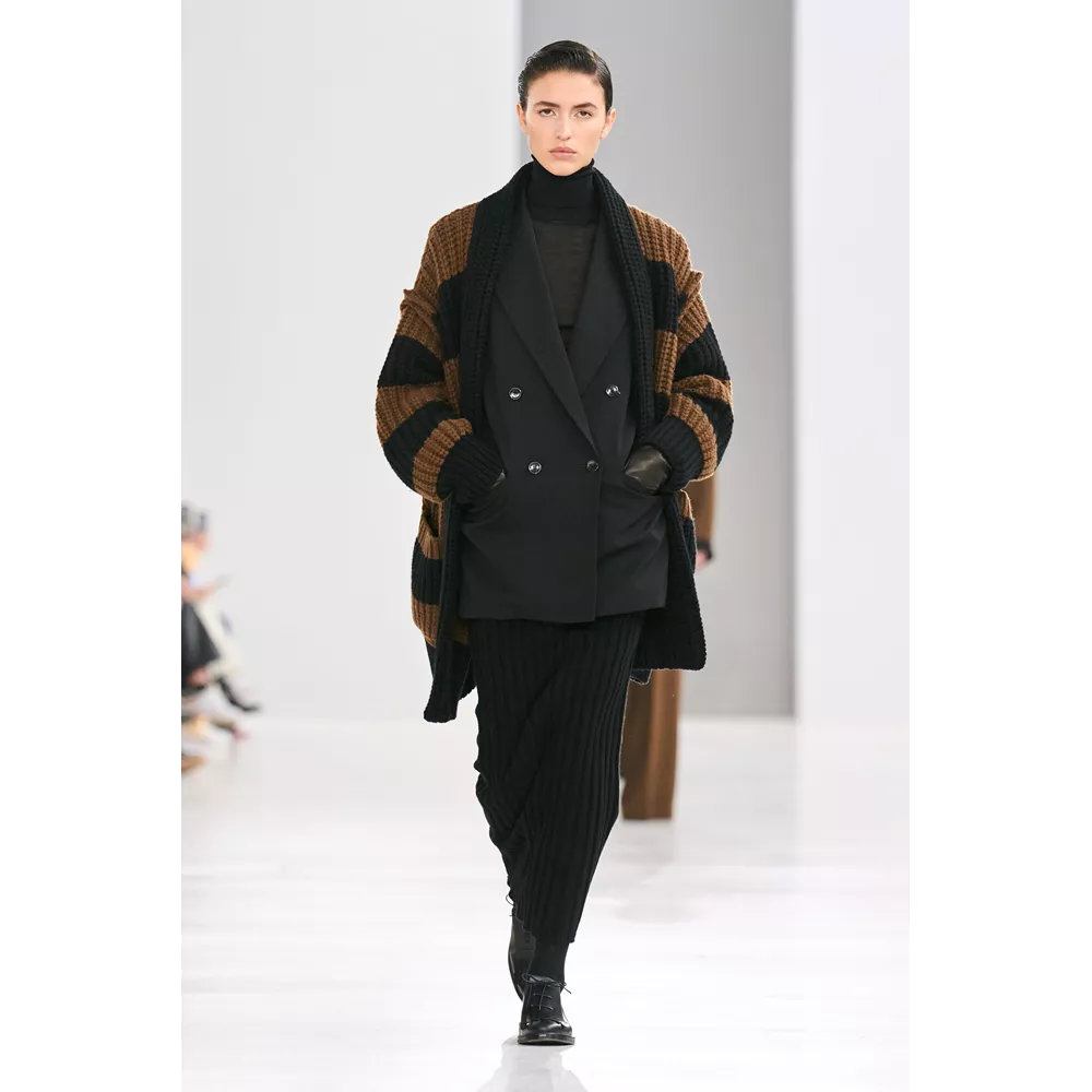 Πλεκτές ριμπ φούστες φοριούνται με tailored blazers, oversized ριμπ πουλόβερ με μάξι φούστες και παντελόνια - καμπάνα - τα οποία ούτως ή άλλως πρωταγωνιστούν σ' αυτή τη συλλογή, cable - knit φορέματα στέκονται εντυπωσιακά από μόνα τους και οι πλεκτές ζακέτες γίνονται ο πιο σοβαρός παίκτης του χειμερινού layering. Caban coats, pea coats, δερμάτινα τζάκετ συμπληρώνουν την ονειρεμένη ποικιλία από δυναμικά πανωφόρια για τη σύγχρονη γυναίκα, που η Max Mara ξέρει πολύ καλά πώς να δημιουργεί. Η γυναικεία θηλυκότητα αποτυπώνεται, επίσης, μέσα από looks στα οποία ξεχωρίζουν pencil φούστες με knots στη μέση ή wrap φούστες που συνδυάζονται λιτά με ζιβάγκο, κοντά ολόσωμα σορτς που υιοθετούν το ανδρόγυνο pinstripe και μίνιμαλ μακριές ολόσωμες φόρμες διακοσμημένες διακριτικά με κρυστάλλους.