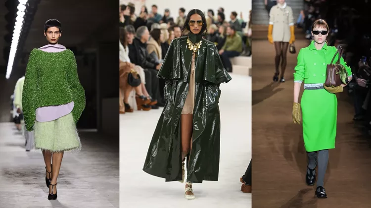 H συλλογή του Gucci υιοθετεί διάφορες αποχρώσεις του πράσινου σε διαφορετικές υφές, η Miu Miu προτείνει φωτεινά apple green ταγέρ και mohair φούστες σε jade, ο Jil Sander κοστούμι σε ανοιχτό πράσινο και η Loewe αγκαλιάζει την ιδέα του mint για το Φθινόπωρο 2024. Στο Ferragamo έχουμε τη λαδί εκδοχή του leather, στο Erdem την πράσινη - πετρόλ, ενώ στην Chloé τη γυαλιστερή του σκούρου pine πράσινου. To χακί γίνεται σήμα - κατατεθέν της Φ/Χ 2024 - 25 συλλογής του Burberry, ενώ το καθαρομαιμο λαδί βρίσκεται ανάμεσα στις looks του Saint Laurent που στηρίχτηκαν στις γήινες και καραμελένιες αποχρώσεις. Dries Van Noten και JW Anderson κάνουν statement με τα έντονα πράσινα πλεκτά τους, ενώ μία pencil καπιτονέ φούστα σε παστέλ απόχρωση του πράσινου είναι αυτή που ξεχωρίζει στη συλλογή του Preen.
