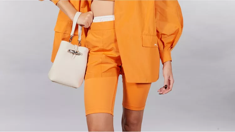 Η Μαλαματένια Παλατσίδη κρατά μία πρακτική και κομψή bucket τσάντα Le Roseau σ' ένα χρώμα που είναι διαχρονικό και ταιριάζει με τα πάντα: το εκρού. Το must-have σακάκι Kimono από τη χειμερινή συλλογή της Longchamp έρχεται σ' ένα ζωντανό και φωτεινό πορτοκαλί χρώμα και συνδυάζεται με cycling shorts και μπουστάκι στην ίδια απόχρωση κάνοντας ακόμα πιο εντυπωσιακή την εμφάνιση. Ένα εμπριμέ μεταξωτό μαντήλι είναι η πινελιά του απόλυτο "παριζιάνικου chic" στο look και φοριέται με δυο διαφορετικούς τρόπους: είτε δεμένο στον λαιμό ή στη μέση ως ζώνη κρατώντας το iconic σακάκι κλειστό στη μέση.