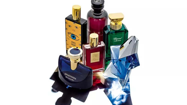 Από αριστερά και δεξιόστροφα: «Marfa», Memo (Attica). «Les Sables Roses», Louis Vuitton (Boutique Louis Vuitton). «Rose Seljuke», Chopard Collection (Boutique Chopard). «Angel», Thierry Mugler. «Rolling in Love», Kilian (Attica). «Splendida Tubereuse Mystique», Bulgari.