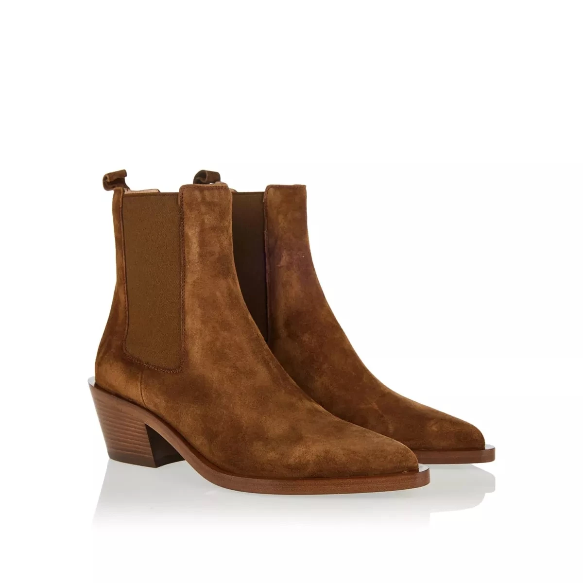 Το σουέτ και το καφέ / ταμπά χρώμα μοιάζουν αδιαίρετα στο στιλ γι' αυτό και οι περισσότερες προτάσεις σε ankle boots απαντούν σ' αυτό το χρώμα. Στη συλλογή Tod's θα βρείτε το κλασικό σχέδιο ankle boots με χοντρό τακούνι, ενώ Manolo Blahnik και Saint Laurent επιλέγουν για τις προτάσεις τους το λεπτό τακούνι που δείχνει πιο θηλυκό. Στη συλλογή Aquazzura θα βρείτε μια κομψή two-tone εκδοχή σουέτ μπότας με μύτη από δέρμα, ενώ στον Gianvito Rossi θα ανακαλύψετε τις cowboy μπότες, που λατρεύουν οι fashionistas.